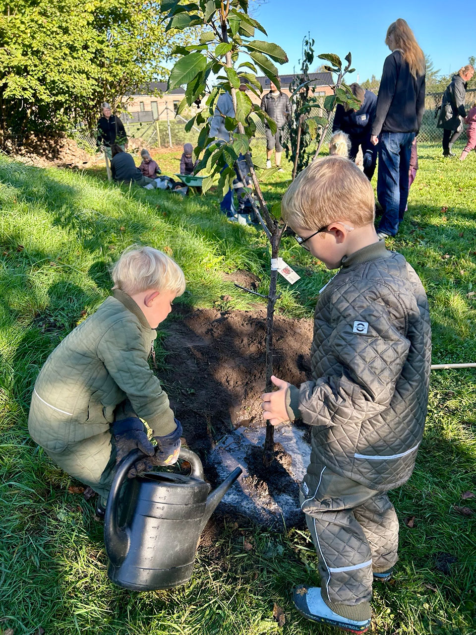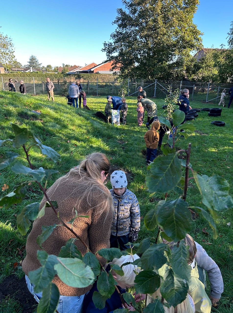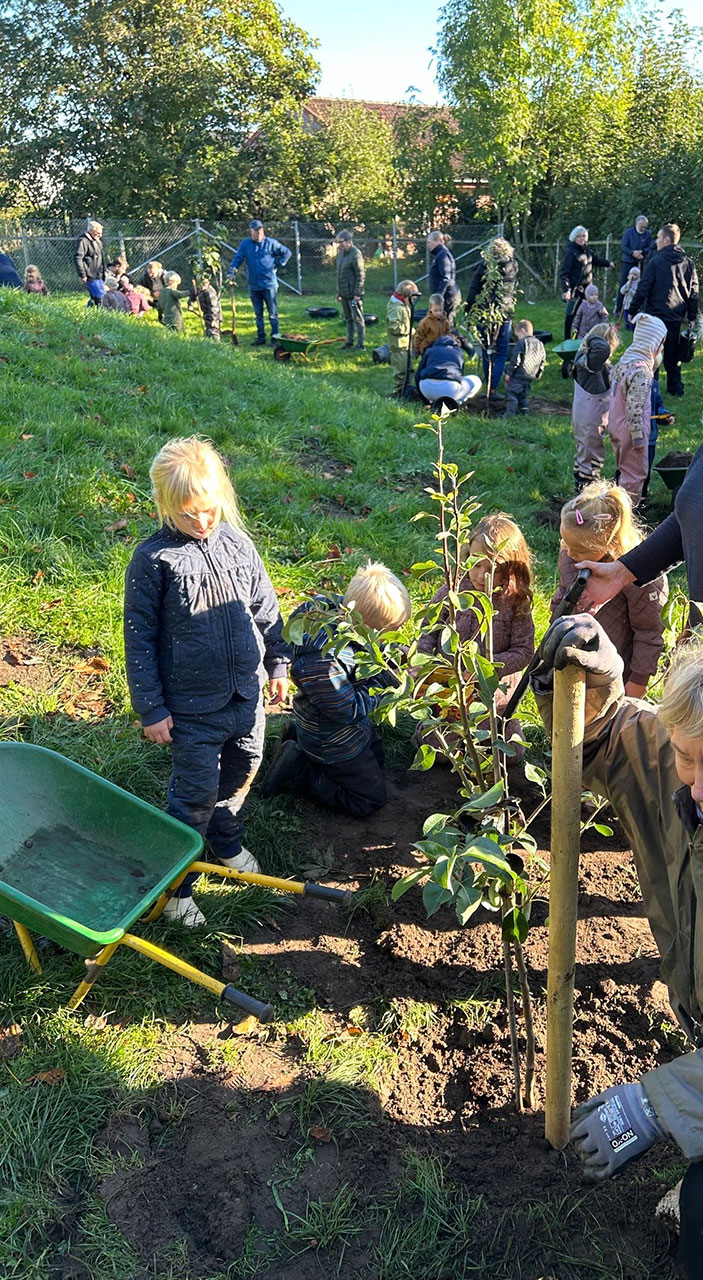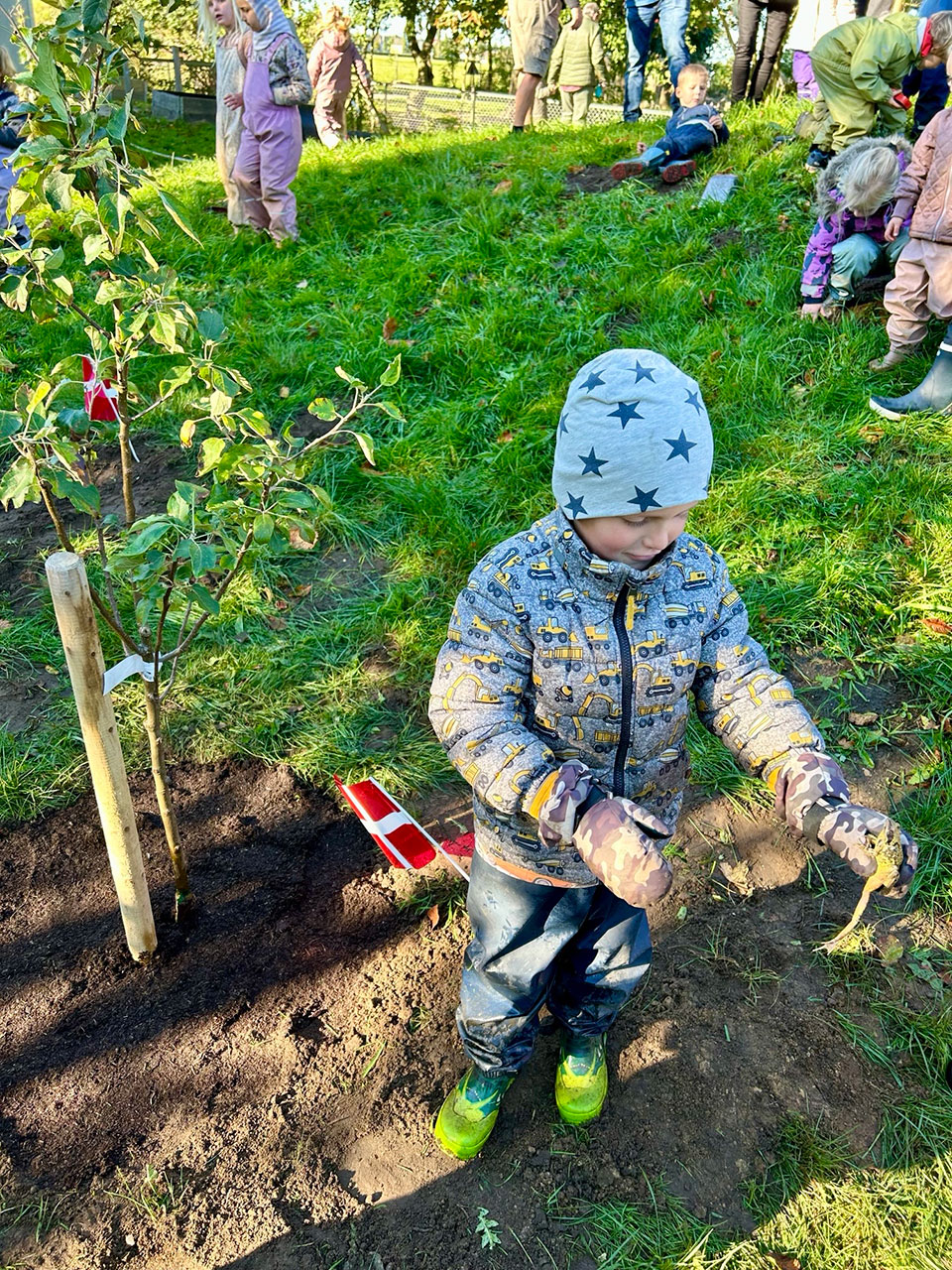 “Kære Plant et Træ. Tusinde tak for frugtlunden. I dag d. 22/9-2025 plantede vi, i selskab med 26 tilmeldte voksen-venner af huset, syv frugttræer og frugtbuske på børnehavens legeplads. Vejret var perfekt, Dannebrog blev hejst, haveredskaberne var medbragt, der var højt humør, vi sang ‘Godmorgen Sol’ og talte ned fra 10 – klappede for opstarten. En dreng fandt en frø, kaffen var klar.